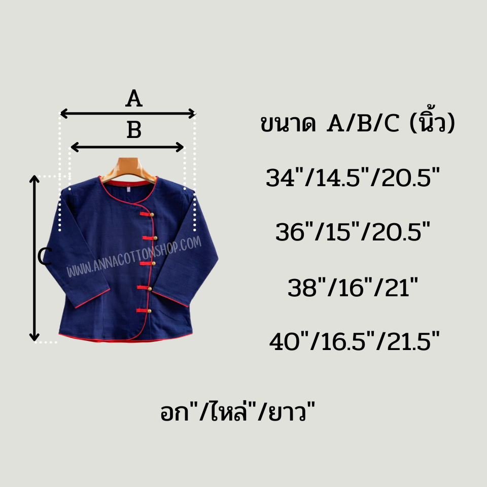 เสื้อผู้หญิงม่อฮ่อมเยื่อไผ่ คอกลมกุ้นผ้าโทเลสีแดงแขน3ส่วน ติดกระดุมสวยๆ มีสีม่อฮ่อม รายละเอียดไซส์/ขนาด(นิ้ว) S/34" M/36" L/38" XL/40"