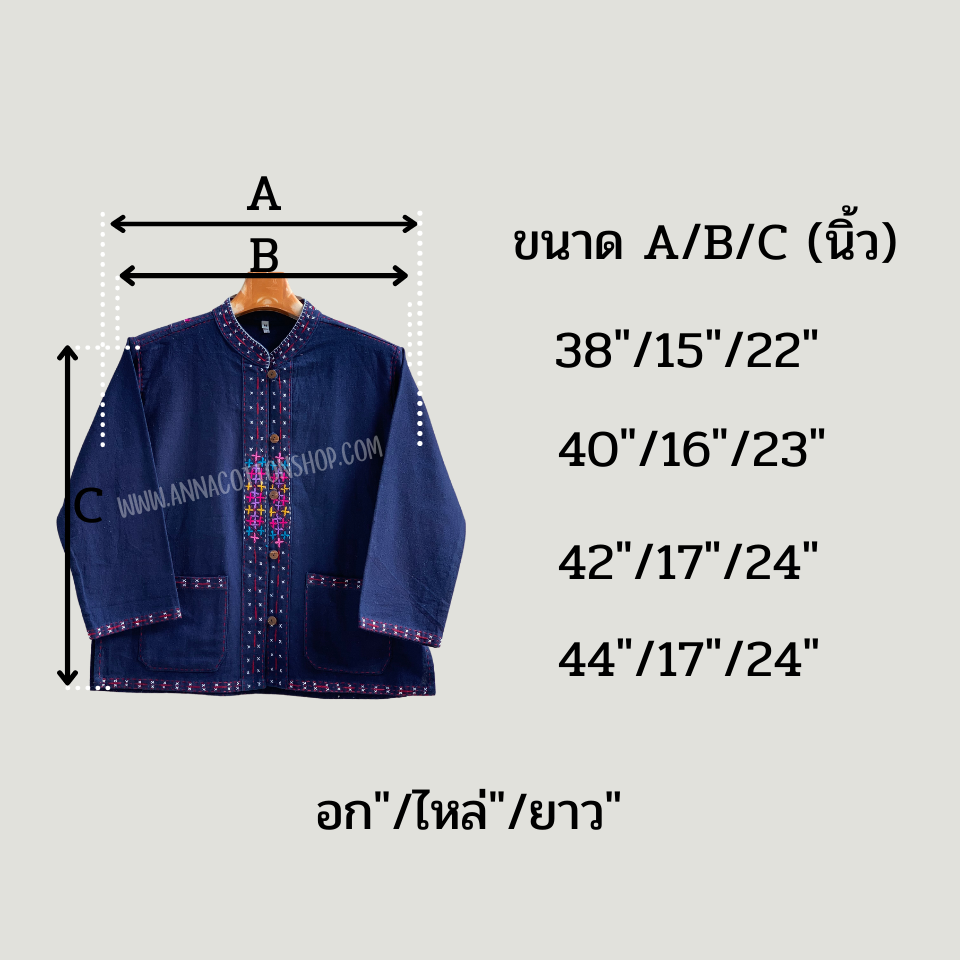 เสื้อม่อฮ่อม คอจีนผู้หญิง งานปักดอกจิกเจ็ดสี ใช้เนื้อผ้าฝ้ายม่อฮ่อมแท้100% งานวาดมือปักแฮนด์เมด ด้วยด้ายไหมประดิษฐ์ มีกระเป๋าสองข้าง กระดุมกะลาโบราณ ผสมผสานงานด้นมืออละคัตเวิร์ค ตามแบบเสื้อเมืองเหนือ