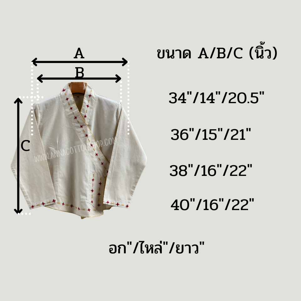 เสื้อผ้าฝ้ายพื้นเมือง ผู้หญิง เนื้อผ้านุ่มมือ วีป้ายแนวเจ้านาง งานปักมือสไตล์ล้านนา เนื้อผ้าฝ้ายพื้นเมือง 11 ปอนด์ เนื้อบางไม่หนามาก ใส่สบาย ระบายความร้อนได้ดี มีสีดิบ(ไม่ย้อมสี) สีขาวนาล สีคราม สวยๆ มีขนาดเริ่มต้น 34" 36" 38" 40" ชอบพอดีตัวใส่ ตามขนาดอกได้เลย ชอบใส่สบายเผื่อ 2 นิ้ว นะคะ ตารางขนาดไซส์ เสื้อเจ้านาง