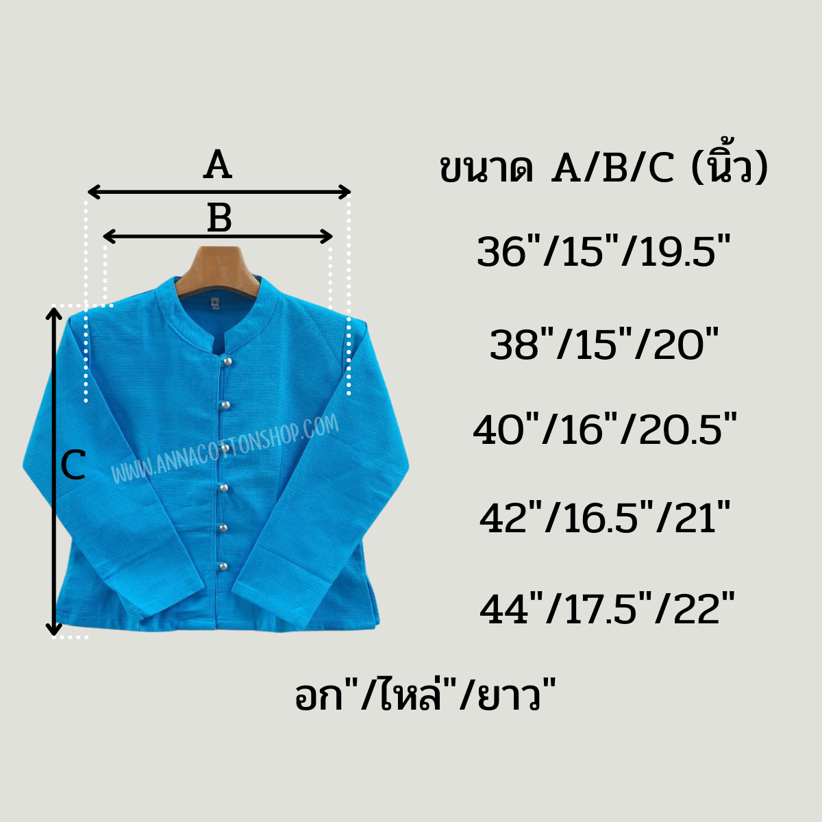 size/อก/เอว/สะโพก/ไหล่/ยาว/วงแขน/ยาวแขน S/36/32/36/15/19.5/15/18.5 M/38/34/38/15/20/16/18.5 L/40/36/40/16/20.5/17/19.5 XL/42/38/42/16.5/21/18/19.5 XXL/44/40/44/17.5/22/19/19.5 ![]() ![]() ![]() ![]() ![]() ![]() ![]() ![]() |