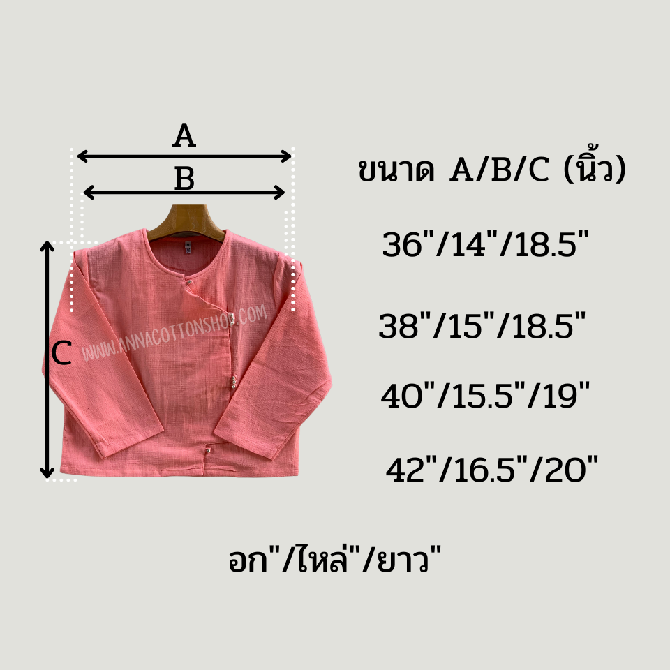 เสื้อผ้าฝ้ายผู้หญิงพื้นเมือง เสื้อคอกลมป้าย ตาจิ๋วแขน3ส่วน สีสันสวยสดใส่ กระดุมกระดิ่ง สีเงินใส 11เม็ด ใส่ทำงานไม่ร้อน มี13 สี